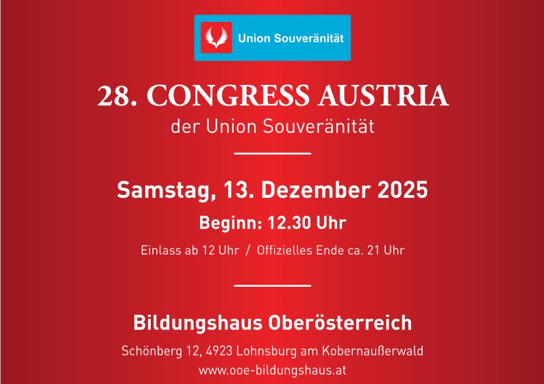 28. CONGRESS AUSTRIA der Union Souveränität Wann: Samstag, 13. Dezember 2025 Beginn: 12.30 Uhr Einlass: ab 12 Uhr  /  Offizielles Ende ca. 21 Uhr Wo: Bildungshaus Oberösterreich, Schönberg 12, 4923 Schönberg (ehem. Gasthof Reisecker) Alle Details zum 28. Congress AustriaDas vollständige Programm mit den hochkarätigen Referenten, alle organisatorischen Hinweise sowie die Anmeldung findet Ihr übersichtlich […]