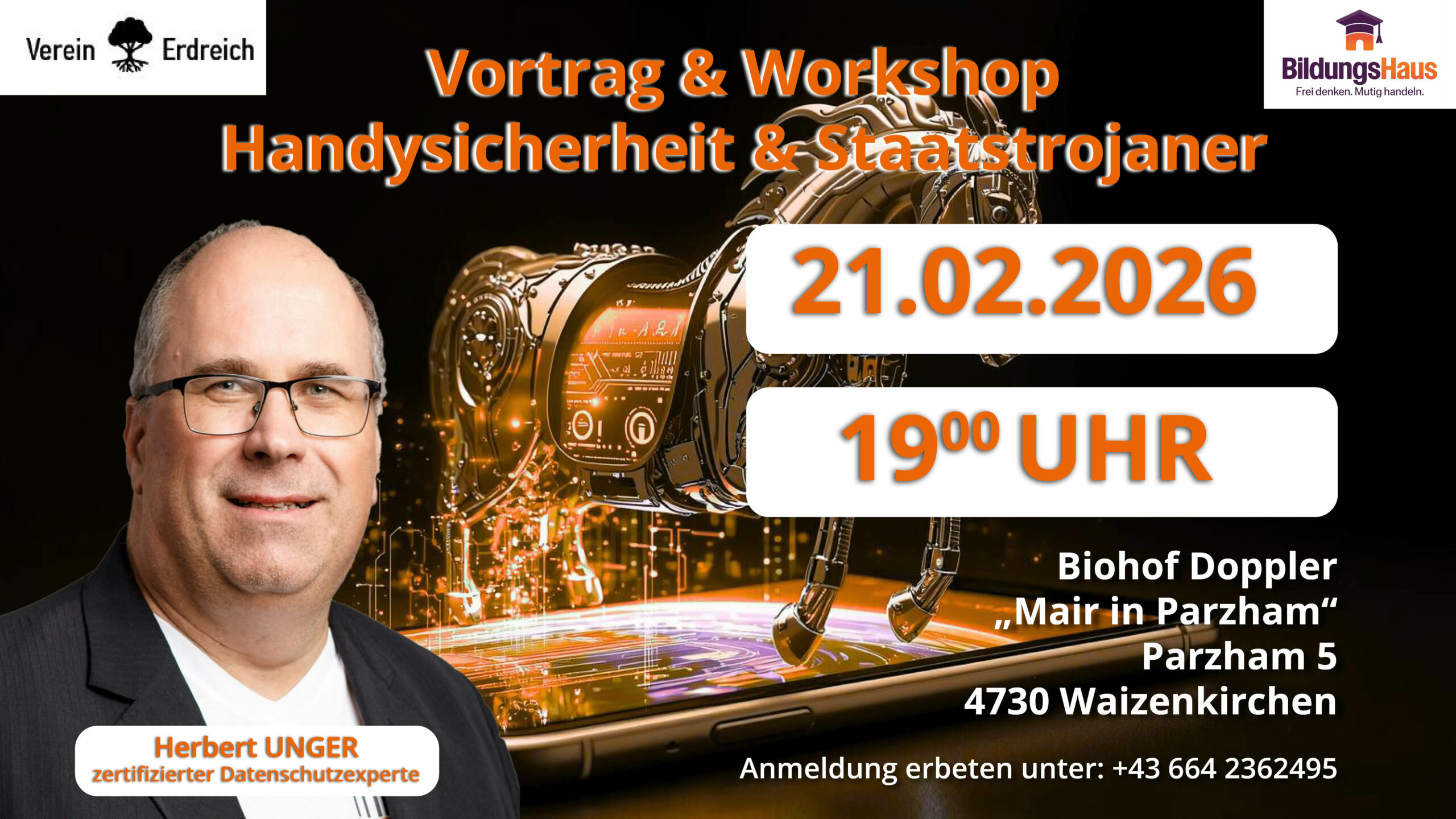 Einladung Vortrag & Handy-Workshop Der Verein Erdreich und das Bildungshaus Oberösterreich laden herzlich zu einem informativen und praxisnahen Abend rund um digitale Selbstbestimmung und Sicherheit am Smartphone ein. Vortragender: Herbert Unger – zertifizierter Datenschutzbeauftragter mit langjähriger Schulungs- und Beratungserfahrung; Zusatzausbildungen unter anderem als IKT-Sicherheitsbeauftragter. Wann: Samstag, 21. Februar 2026 Beginn: 19:00 Uhr Wo: Biohof […]