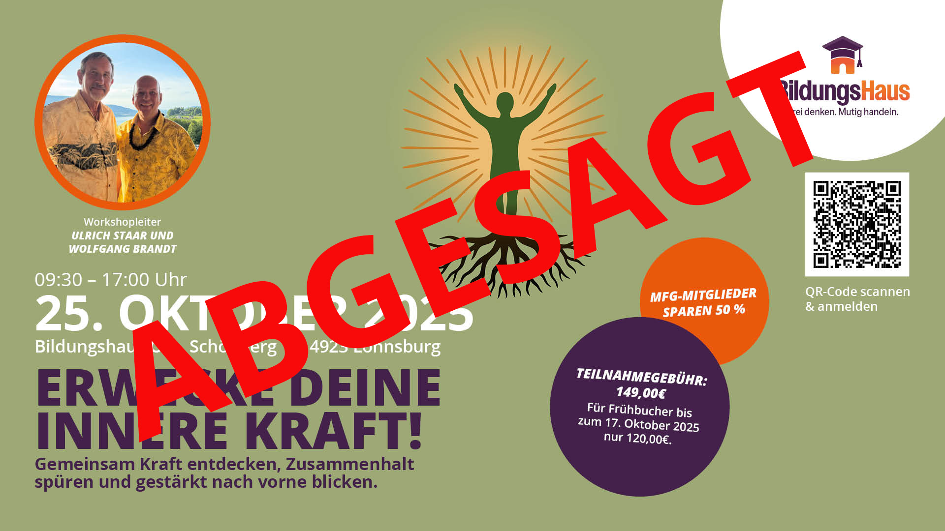 ABGESAGT! Workshop Erwecke deine innere Kraft! Workshopleiter: Ulrich Staar & Wolfgang Brandt   Was erwartet dich? Entdecke und nutze deine ursprüngliche Energie Wachse mit deiner inneren Stärke. Räume Hindernisse aus dem Weg und gehe klar deinen Lebensweg Verbinde dich kraftvoll mit dir selbst und integriere diese stärkende Qualtiät in dein Leben Lerne, negative Energien friedvoll […]
